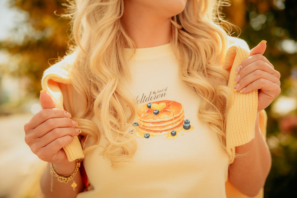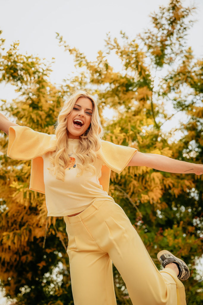 Žuta je boja koja odmah donosi radost i ta boja ovog proljeća vlada našim izlozima, stoga joj nije bio problem pronaći modnu kombinaciju u tim nijansama. Za ovaj outfit je u trgovini C&A odabrala poslovne hlače visokog struka i širih nogavica u prekrasnoj maslac žutoj boji, uz T-shirt s printom palačinki – veselo, pomalo zaigrano i baš proljetno. Žuta vesta kratkih rukava prebačena preko ramena dodatno je dala slojevitost i stil, a upečatljiva žuta torbica iz Deichmanna upotpunila je look.