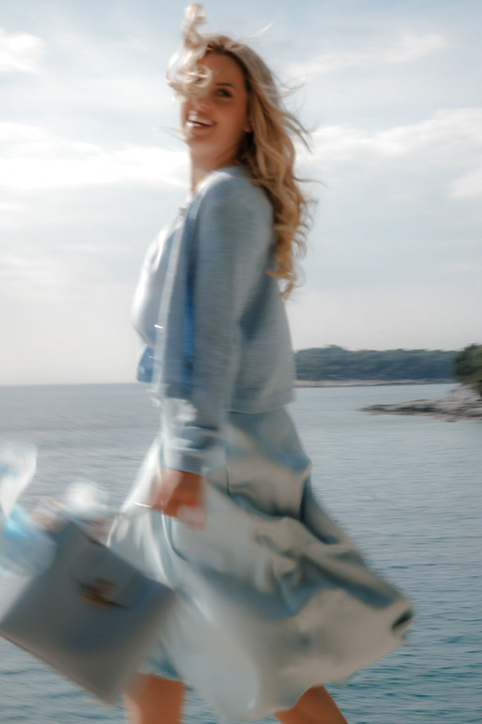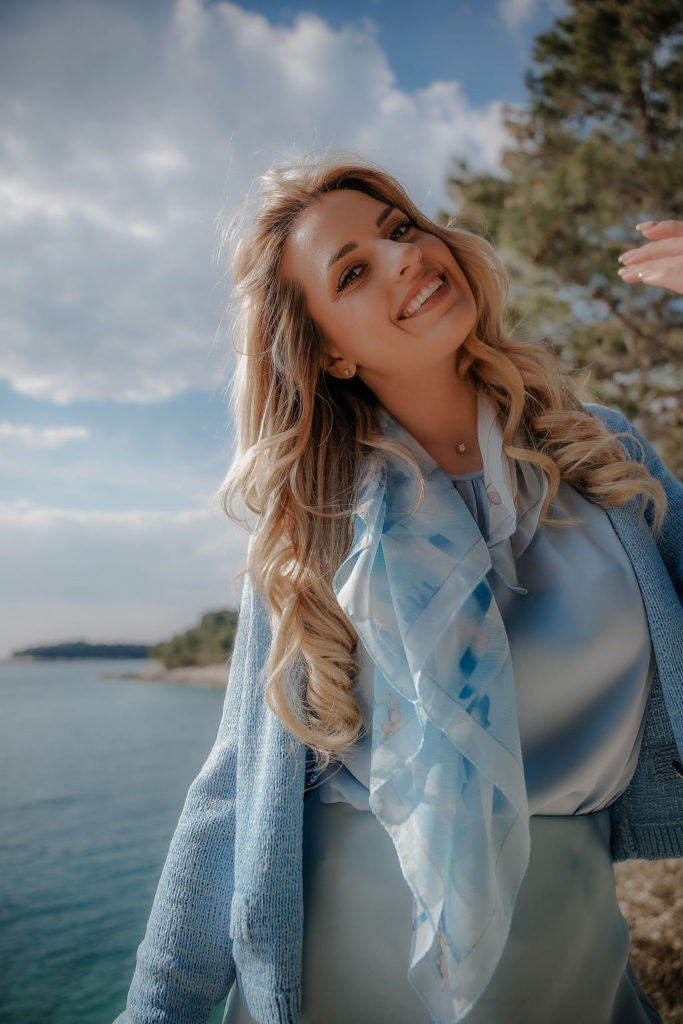 Plava boja uvijek nas podsjeća na more i njegove beskrajne nijanse, te je ovaj put Ana inspiraciju izvukla baš iz – mora. Cjelokupni outfit pronašla je u trgovini Sportina (by Modiana). Svilenu suknju visokog struka do koljena svijetlo plave boje spojila je sa svilenim topom u morsko plavoj boji i tankom končanom vestom u sličnim tonovima, te pokazala kako različite nijanse i materijali mogu stvoriti skladan i elegantan proljetni outfit. Svilena marama zanimljivog uzorka u plavoj boji i moderna plava torbica oblika koji će ove godine biti hit – dodatno su podigli styling na još jednu razinu.
